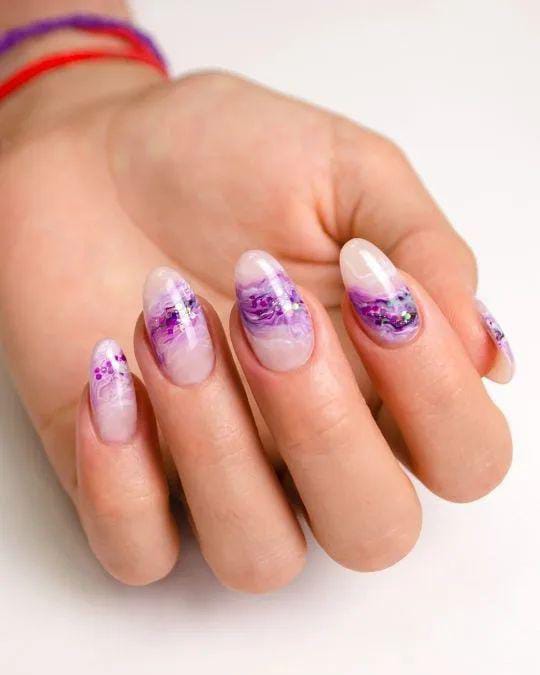 Sheer nude nails blend into soft purple marble waves with a subtle shimmer. The overall look is calm, feminine, and effortlessly graceful spring mood.