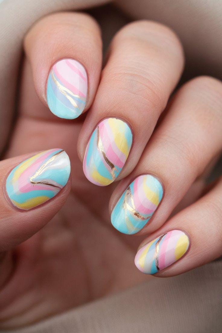 Creamy nude nails are accented with pastel swirls in pink, blue, yellow, and lavender for a playful marble effect. The design feels fun, colorful, and cheerful like spring candy.