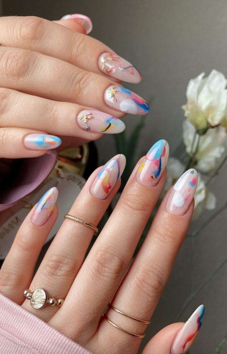 Sheer nude bases are layered with airy brushstroke-style marbling in bright spring colors. The overall vibe is artistic, fresh, and modern with a soft elegance.