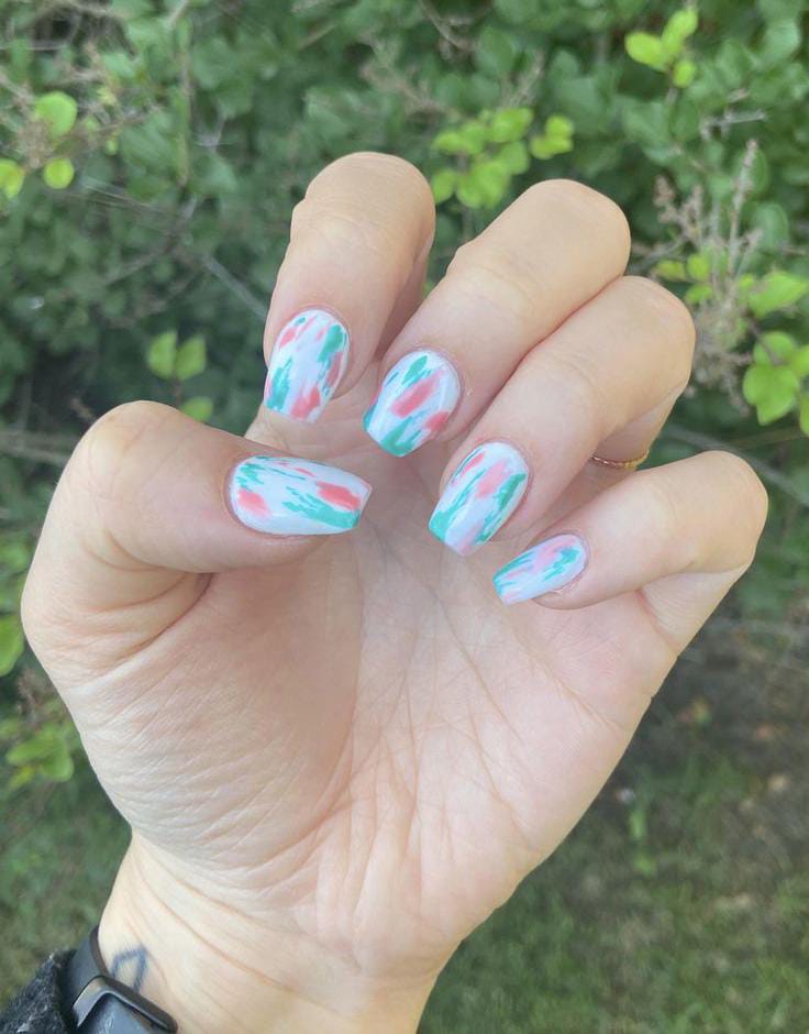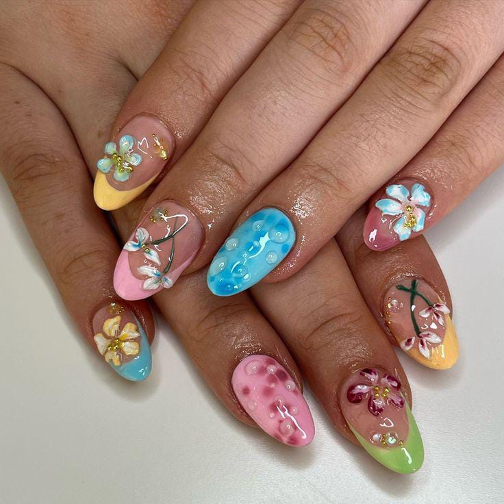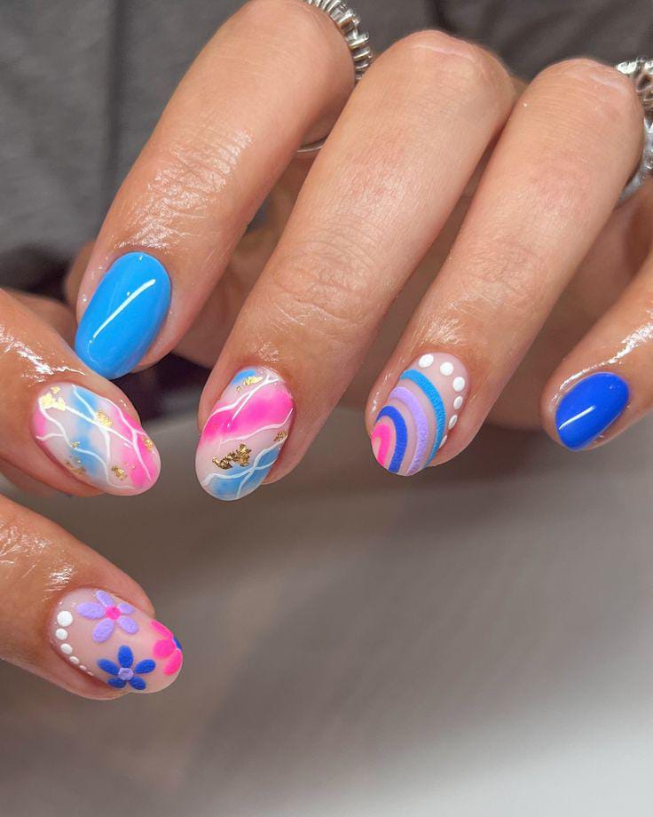 Bold blue, pink, and lilac marble accents add energy and movement to the nails. The mix feels artistic, fun, and full of seasonal personality.