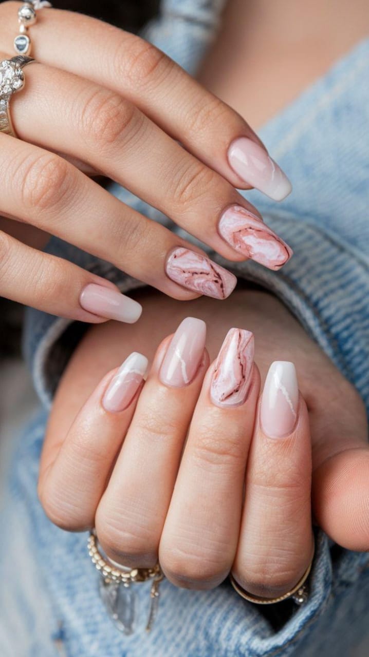 Classic nude nails are finished with soft pink marble tips for a modern French-style twist. The look is polished, minimal, and perfect for everyday spring wear