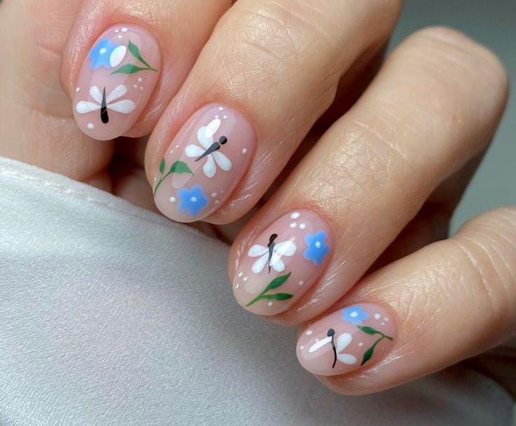 A soft nude base is paired with tiny blue and white florals for a fresh spring feel. The look is delicate, airy, and effortlessly pretty.