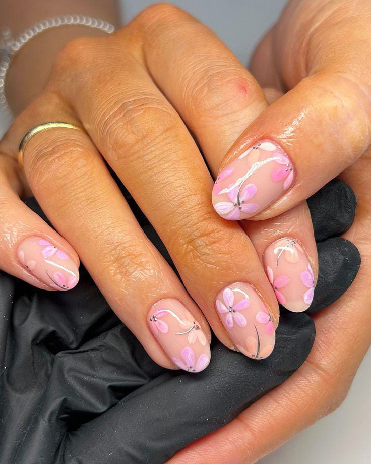 Sheer blush-nude nails feature delicate white and pastel florals for a clean, polished look. This design feels subtle, feminine, and effortlessly elegant for everyday spring wear.