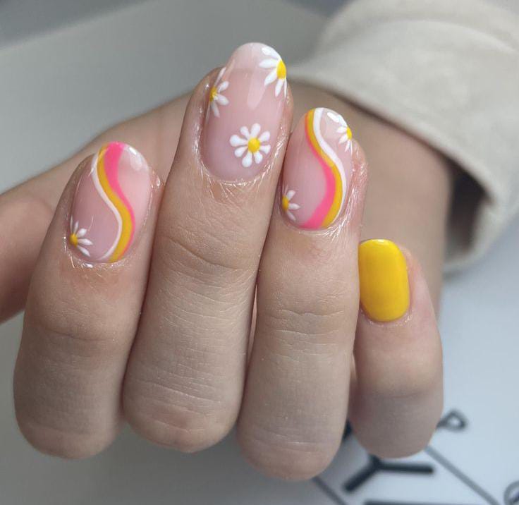 A nude background is brightened with small white daisies and playful pink-and-yellow waves. The vibe is cheerful, youthful, and spring-ready.