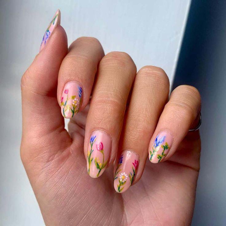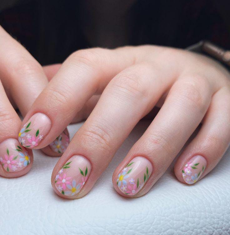 A warm nude base features small hand-painted flowers in pink, blue, and green tones. The style feels cheerful, natural, and inspired by spring gardens.