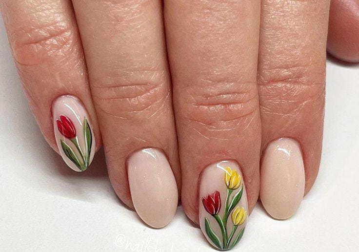 This design features a creamy nude base with delicate hand-painted tulips in red and yellow tones. The overall vibe is fresh, minimal, and perfectly spring-inspired.