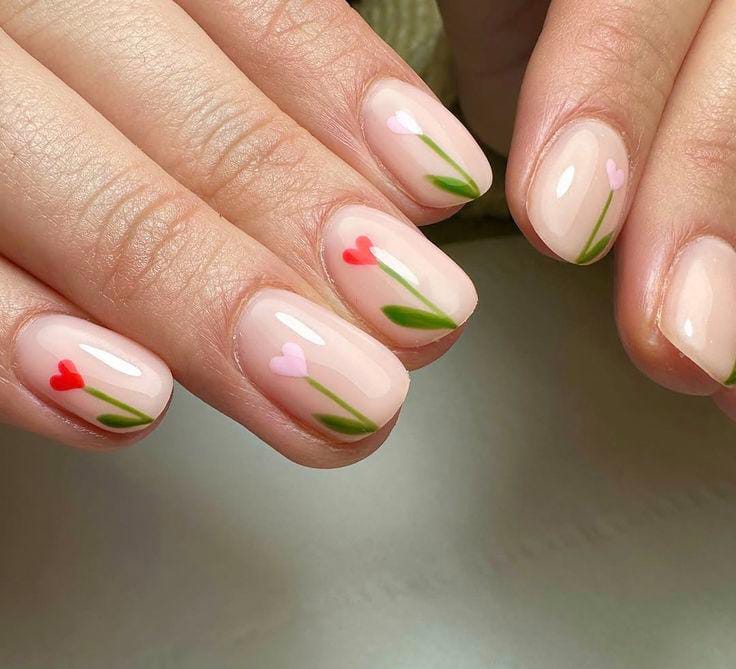 This style uses a glossy nude base with small heart-shaped flowers and thin green stems. The design looks cute, clean, and softly romantic spring.