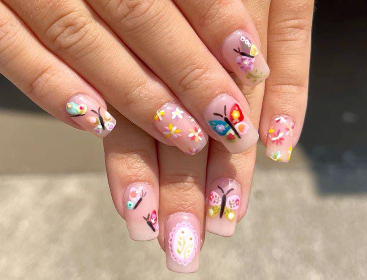 A pale nude base is decorated with colorful mini flowers and butterfly accents across the nails. The vibe is cheerful, youthful, and full of spring energy.