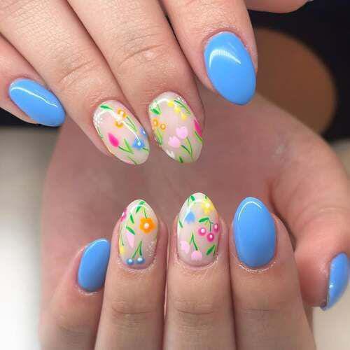 Soft nude bases are paired with bright sky-blue accent nails and playful hand-painted florals. The look feels fresh, cheerful, and perfect for early spring days.