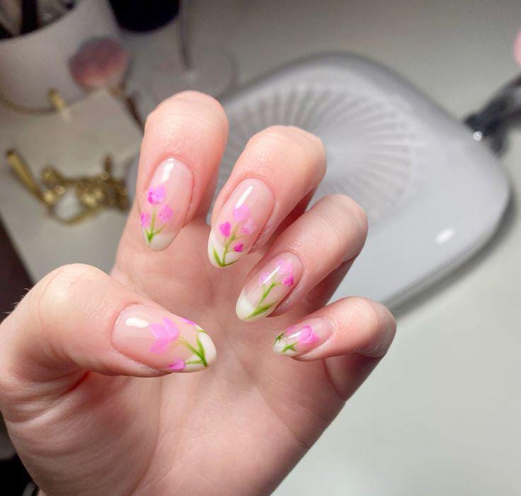 Classic nude nails are elevated with soft pink French tips and fine floral detailing. The style is minimal, classy, and ideal for a refined spring aesthetic.