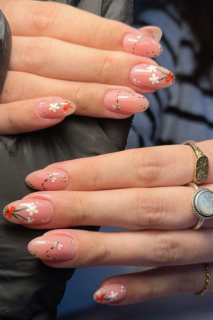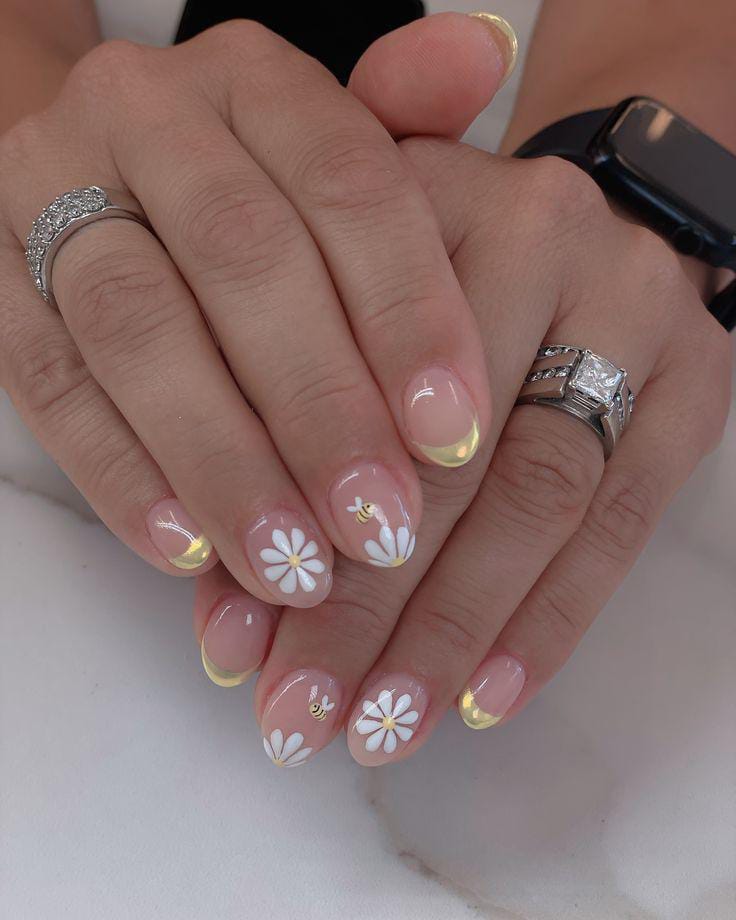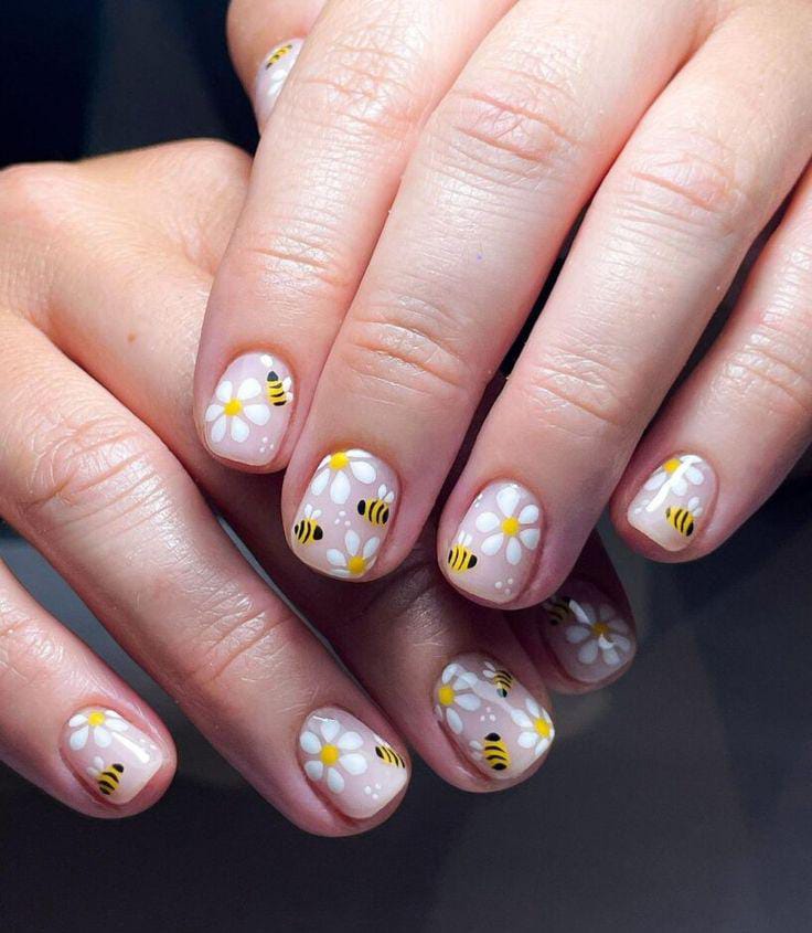 This design features a nude base with white daisy flowers and cute bee accents. It has a cheerful, lighthearted vibe that feels warm and spring-ready.
