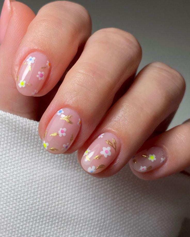 A sheer nude base is paired with small pastel flowers and subtle gold leaf touches. The style feels elegant, soft, and slightly luxurious spring feel.