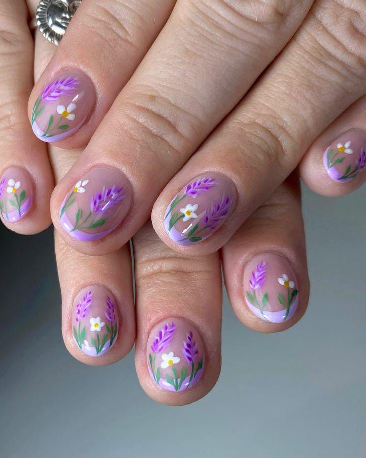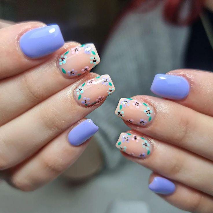 Nude floral accent nails are paired with glossy lavender solids for a gentle pop of color. The combination feels playful, modern, and lighthearted for the spring season.