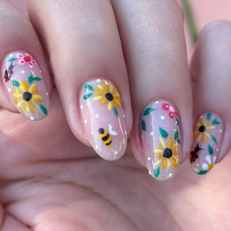 A soft nude base is decorated with cheerful yellow daisies, tiny dots, and playful bee accents. The overall vibe feels fresh, sunny, and perfectly inspired by a spring garden.