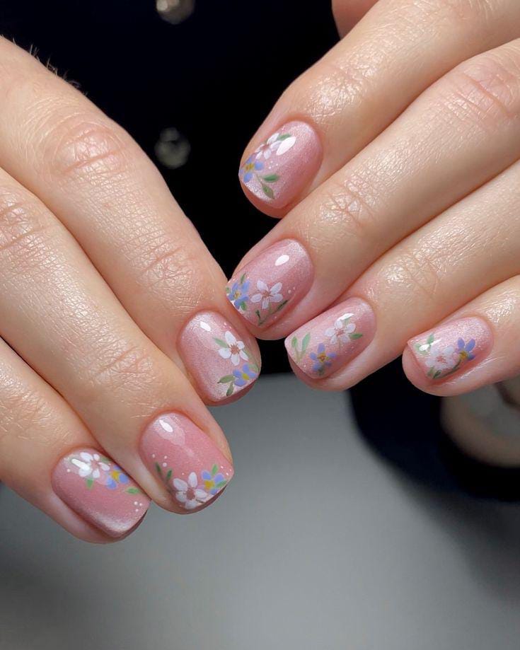 A glossy nude base showcases hand-painted wildflowers in soft pinks and blues. The design feels polished, graceful, and subtly artistic spring.