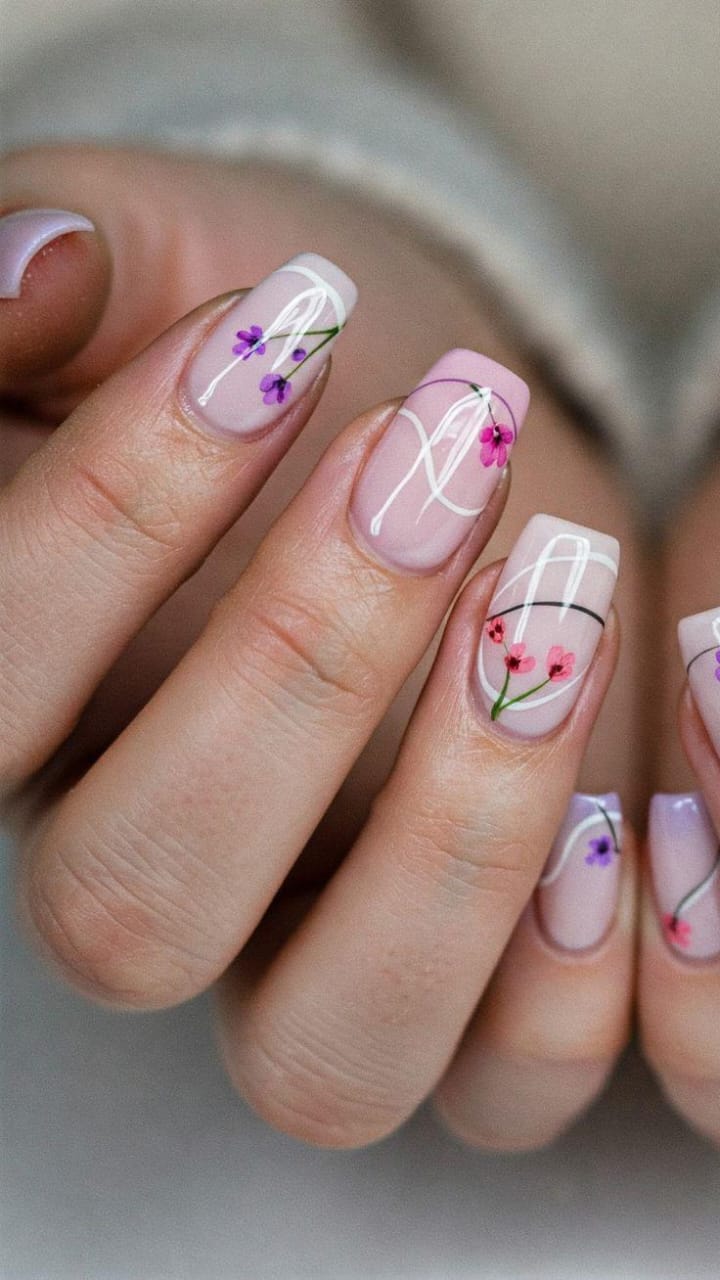 A sheer nude base is paired with fine white swirl lines and tiny purple and pink floral accents. The overall look feels airy, artistic, and effortlessly spring-fresh.