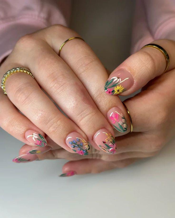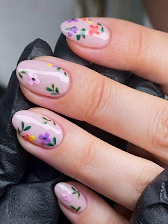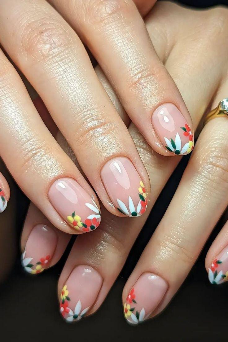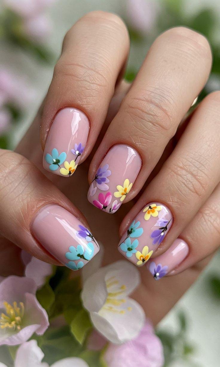 Soft nude nails are enhanced with small, colorful floral details scattered gently across the surface. The design feels sweet, feminine, and subtly artistic spring.