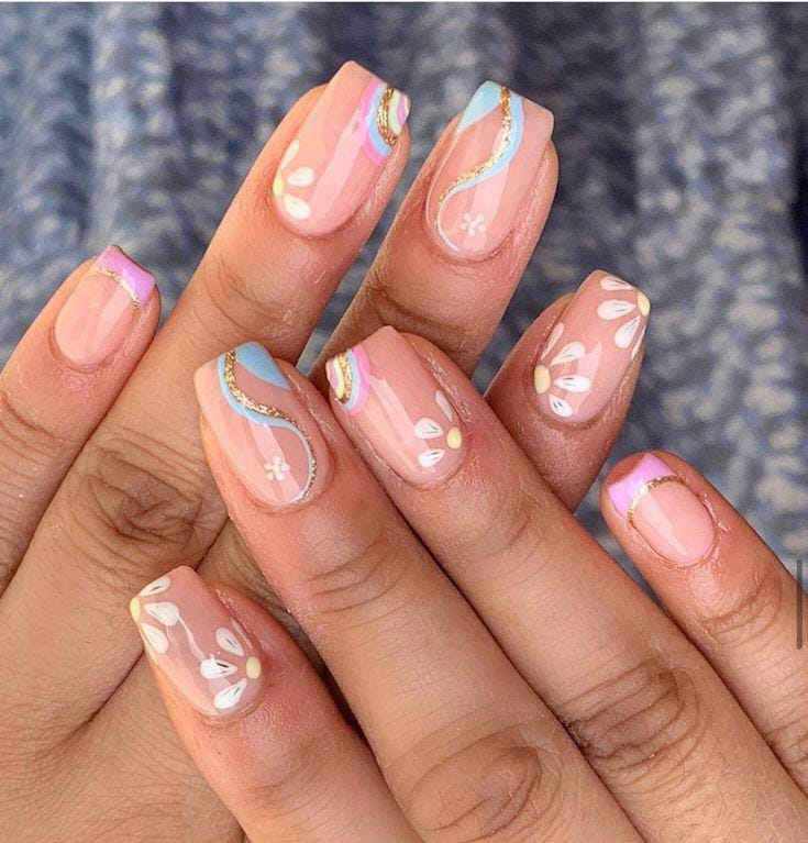 A soft nude base is paired with pastel waves, tiny florals, and thin gold accents for a playful spring look. The overall vibe feels light, artistic, and fresh.