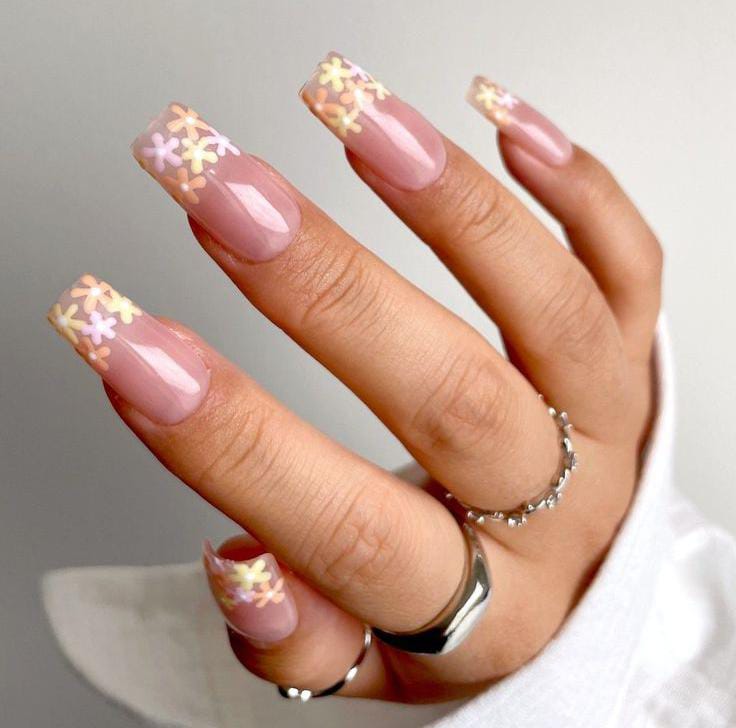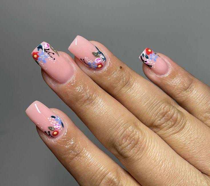 Blush nude nails feature delicate floral accents in pastel pinks, blues, and reds. The design feels cheerful yet polished, perfect for a soft spring statement.