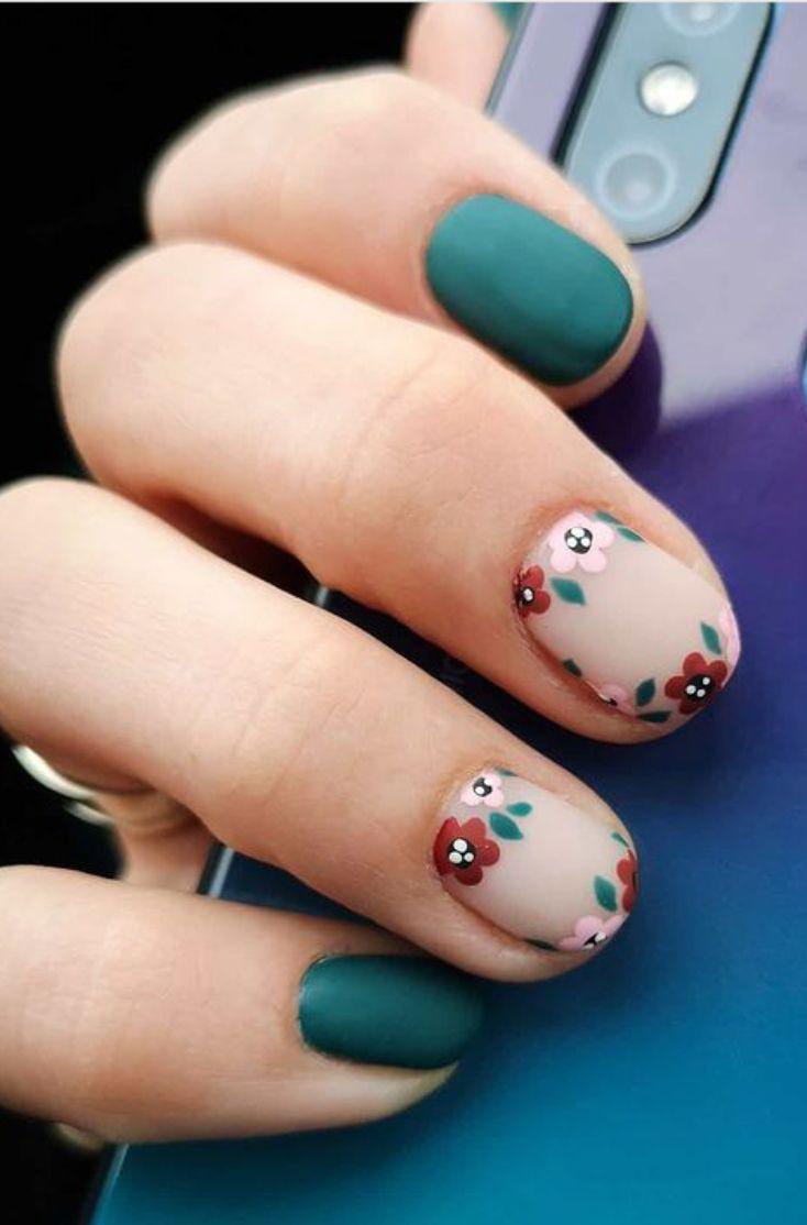 Muted nude nails with tiny floral accents are balanced by deep teal green solid nails. The mix creates a calm, modern spring vibe with a subtle pop of color.