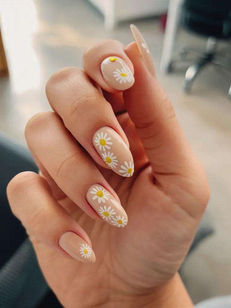 A clean nude base is decorated with simple white daisy patterns and yellow centers. The look is fresh, minimal, and perfectly captures classic spring energy.