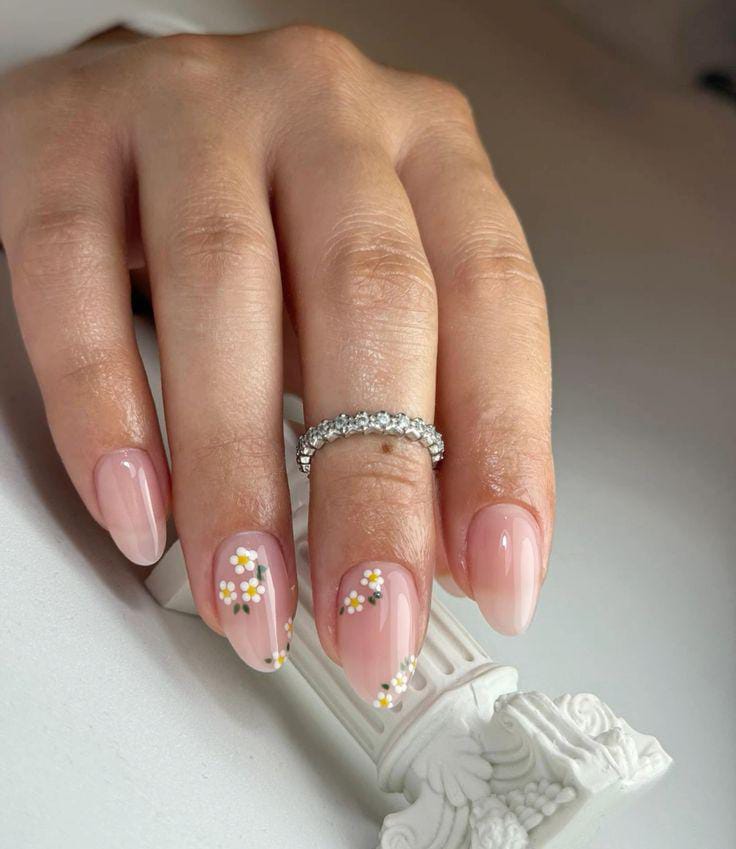 Glossy nude nails with small white daisy details placed delicately across the nail. The look is simple, fresh, and softly romantic spring aesthetic.