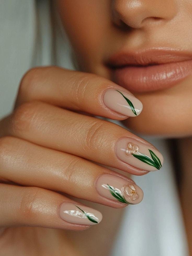 Glossy nude nails are paired with elegant green leaves and tiny neutral flowers for a refined finish. The vibe is minimal, modern, and effortlessly spring-ready.