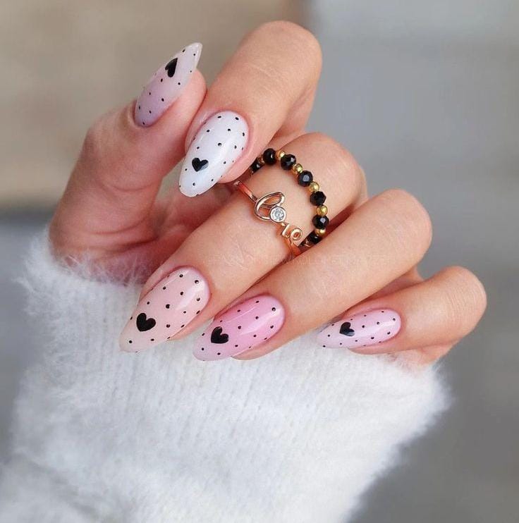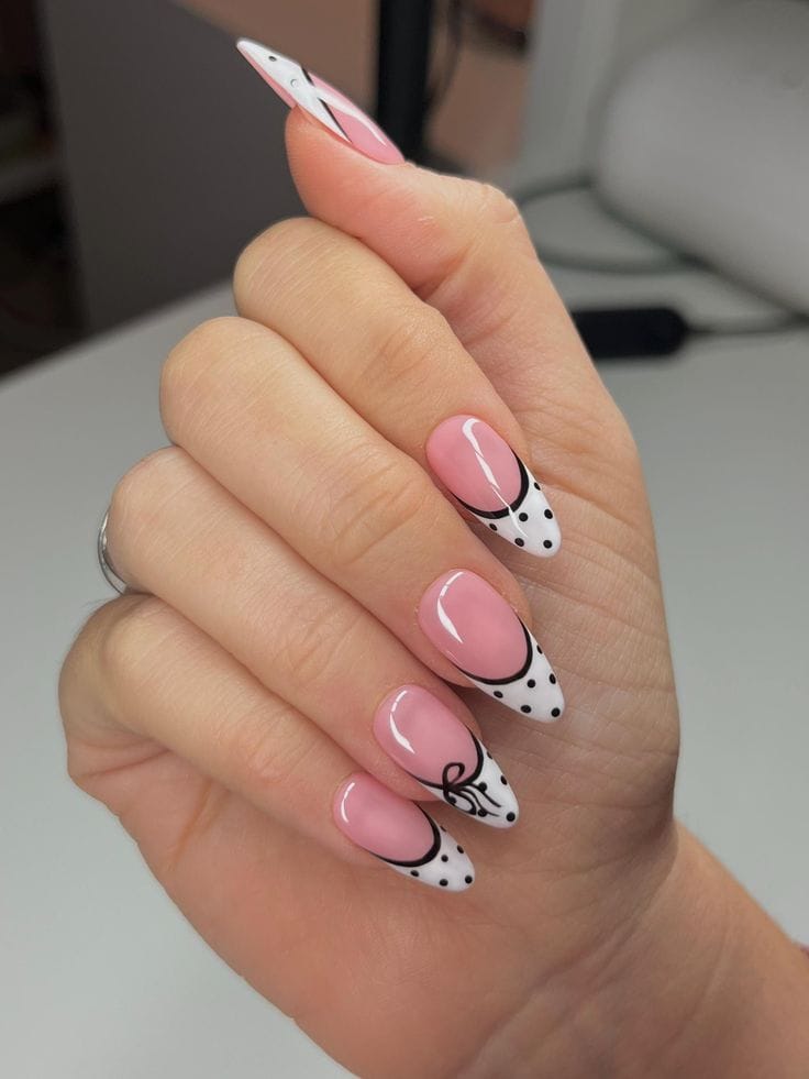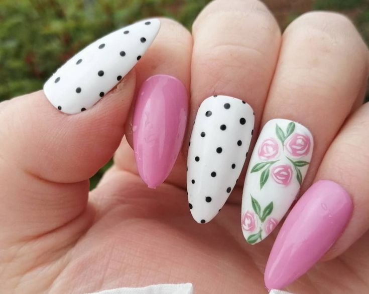 A mix of glossy pink nails, classic black polka dots on white, and a delicate floral accent creates a sweet, feminine vibe. It feels fun yet polished, like spring florals in bloom.