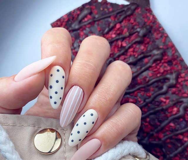 Neutral nude and white tones are combined with black polka dots and a single striped accent nail. The design feels modern, clean, and stylish with a soft spring edge.