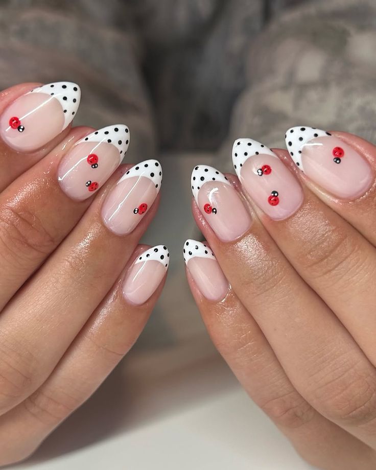 Sheer pink nails are topped with white French tips decorated with tiny black dots and cute red accents. The look is soft, charming, and gives a sweet spring garden vibe.