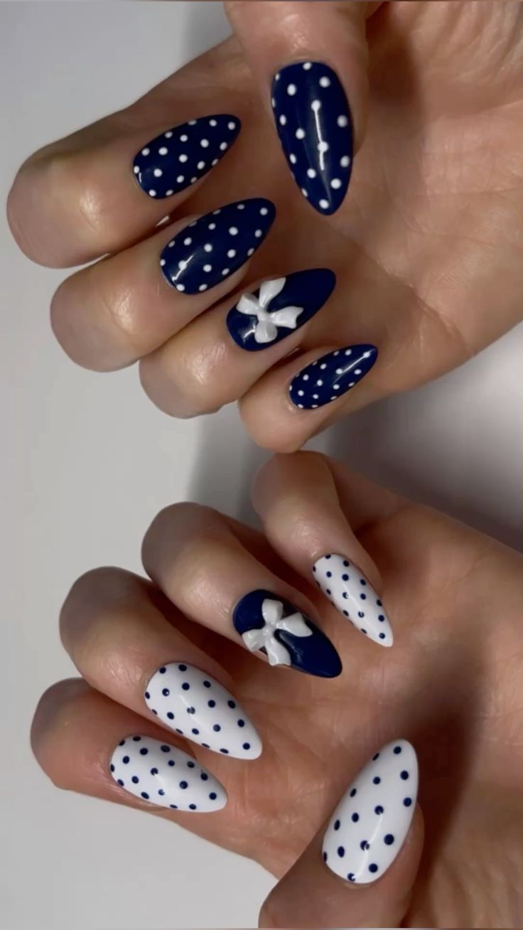Deep navy and white nails are paired with classic polka dots and delicate bow accents. The design feels playful yet refined, with a fresh spring twist on a classic color combo.