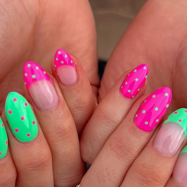 Bright neon pink and green nails with playful polka dots create a bold, energetic spring look. The mix of solid color and negative space keeps the design fresh and fun.
