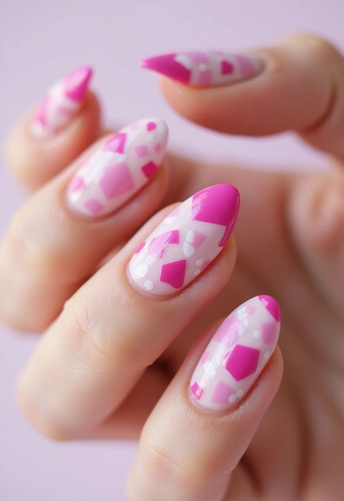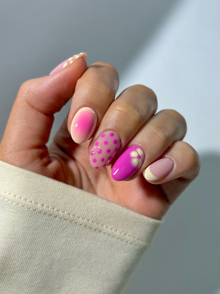 This manicure mixes pastel pinks, creams, and vibrant magenta with subtle polka dot accents and a floral design. The overall look is fresh, colorful, and lighthearted, inspired by sweet spring tones.
