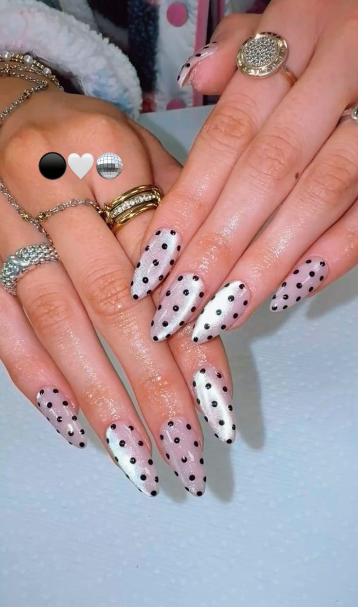 A shimmery, pearly base paired with evenly spaced black polka dots gives this look a chic, slightly glam finish. It balances classic style with a playful edge.