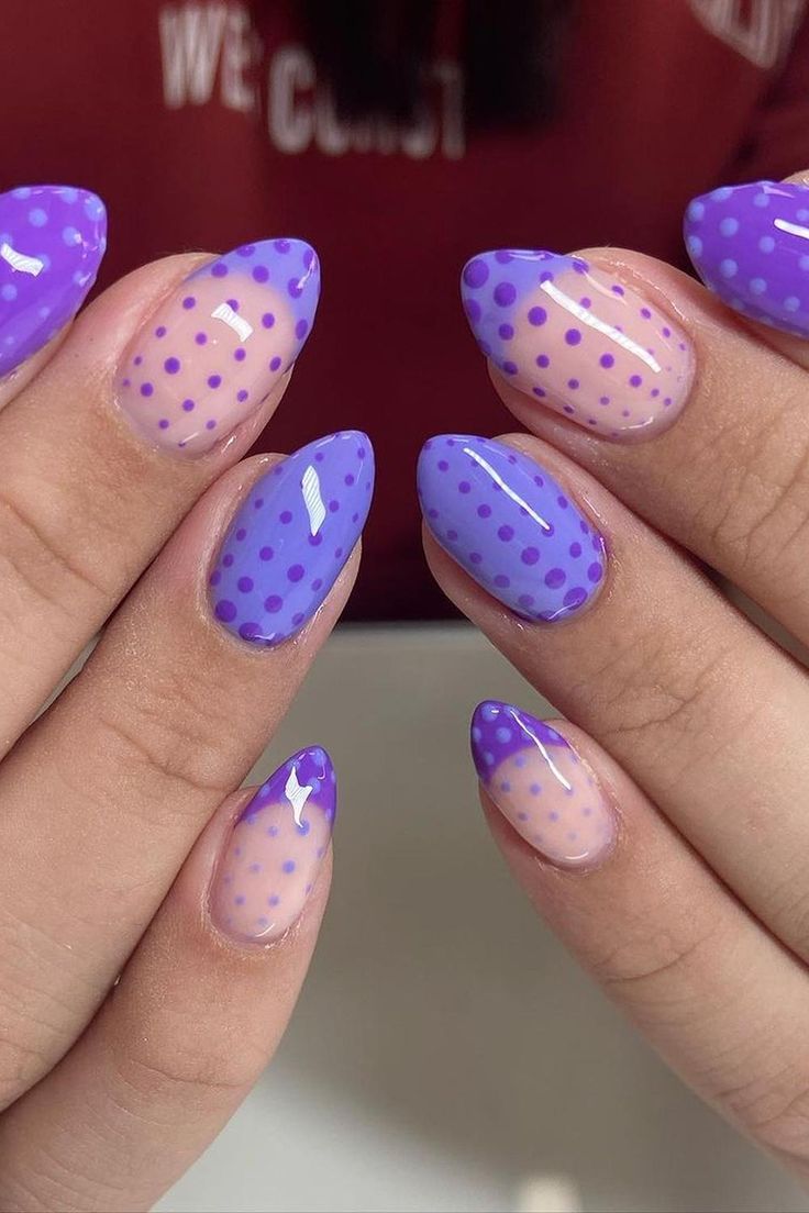 Glossy lavender and nude nails are decorated with neat purple polka dots for a fresh, modern feel. The look is bright, clean, and fun, giving off cheerful spring energy.