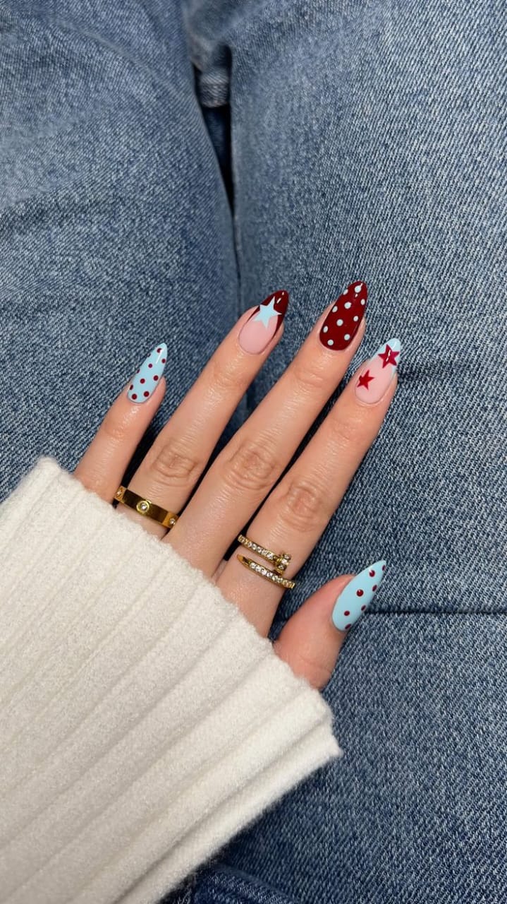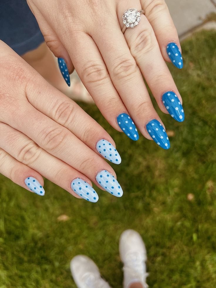 These almond-shaped nails mix soft and bright blue shades with playful white polka dots. The look feels fresh, cheerful, and perfect for a sunny spring day.