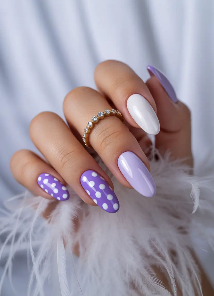 Pastel lavender and crisp white are paired with oversized white polka dots for a clean, playful look. The design feels light, airy, and perfect for a fresh spring manicure.