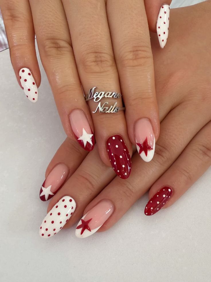 This design combines nude and white bases with bold red polka dots and star details for a statement look. It has a fun, slightly retro vibe while still feeling polished and spring-ready.