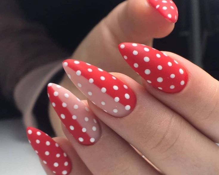 Bright red and soft nude nails are paired with clean white polka dots for a fresh, playful spring look. The almond shape and classic color combo give it a cute yet polished vibe.