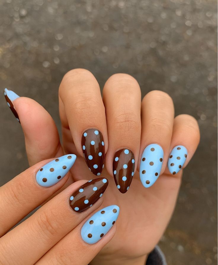 A balanced blend of nude, chocolate brown, and pastel blue creates a sweet, coordinated look with scattered polka dots. The glossy finish and soft colors give it a cozy but trendy spring feel.