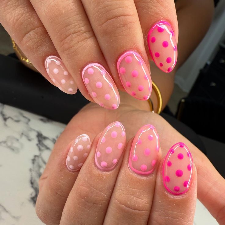 These nails use a translucent nude base layered with bold pink polka dots and glossy outlines. The style feels youthful, trendy, and eye-catching with a playful spring twist.