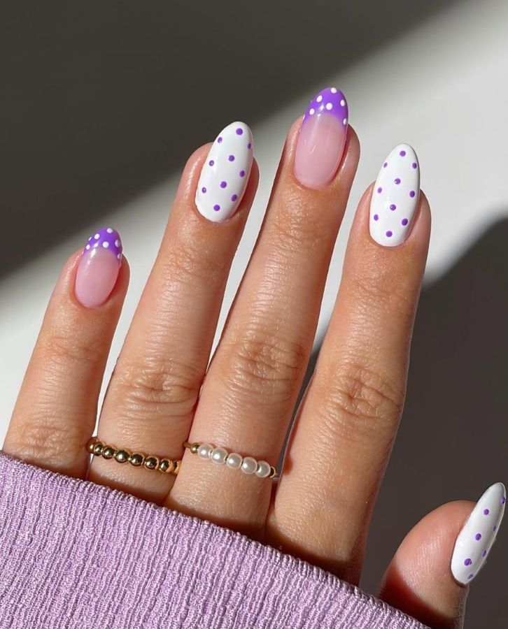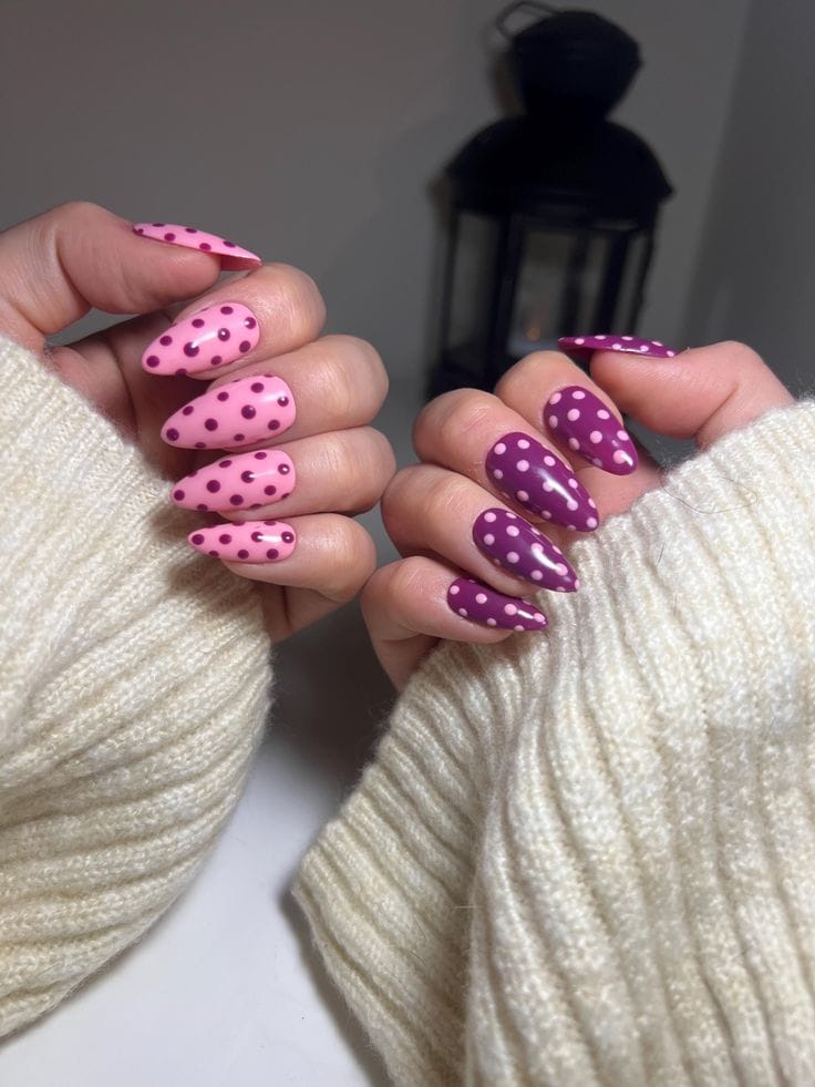 Two-toned pink and purple nails with delicate polka dots give this design a sweet, coordinated look. It feels cozy, trendy, and perfect for an easygoing spring aesthetic.