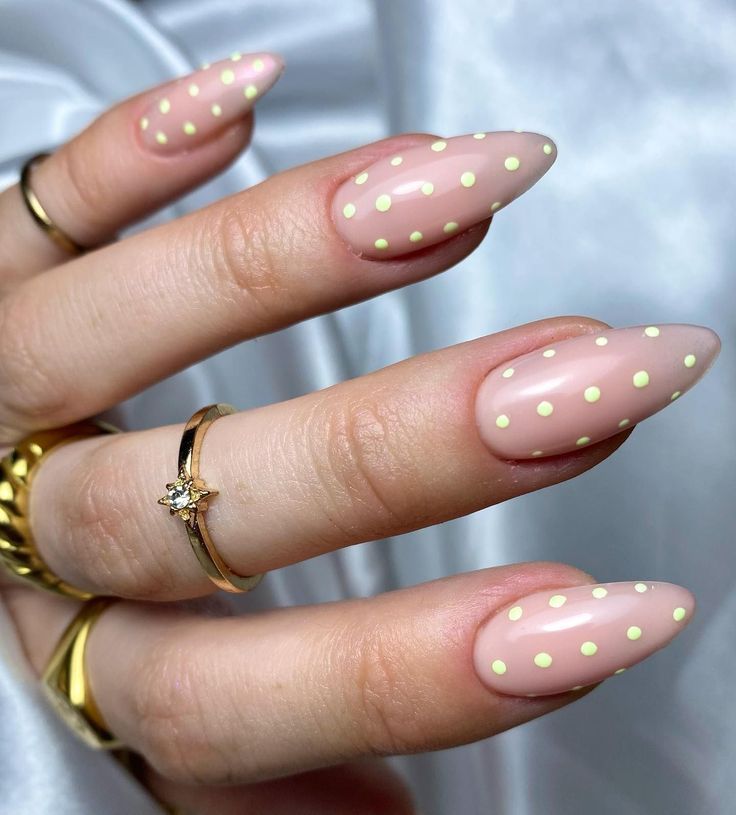 A sheer nude base is decorated with tiny pastel polka dots for a clean, minimal spring look. The overall vibe is fresh, elegant, and effortlessly cute.