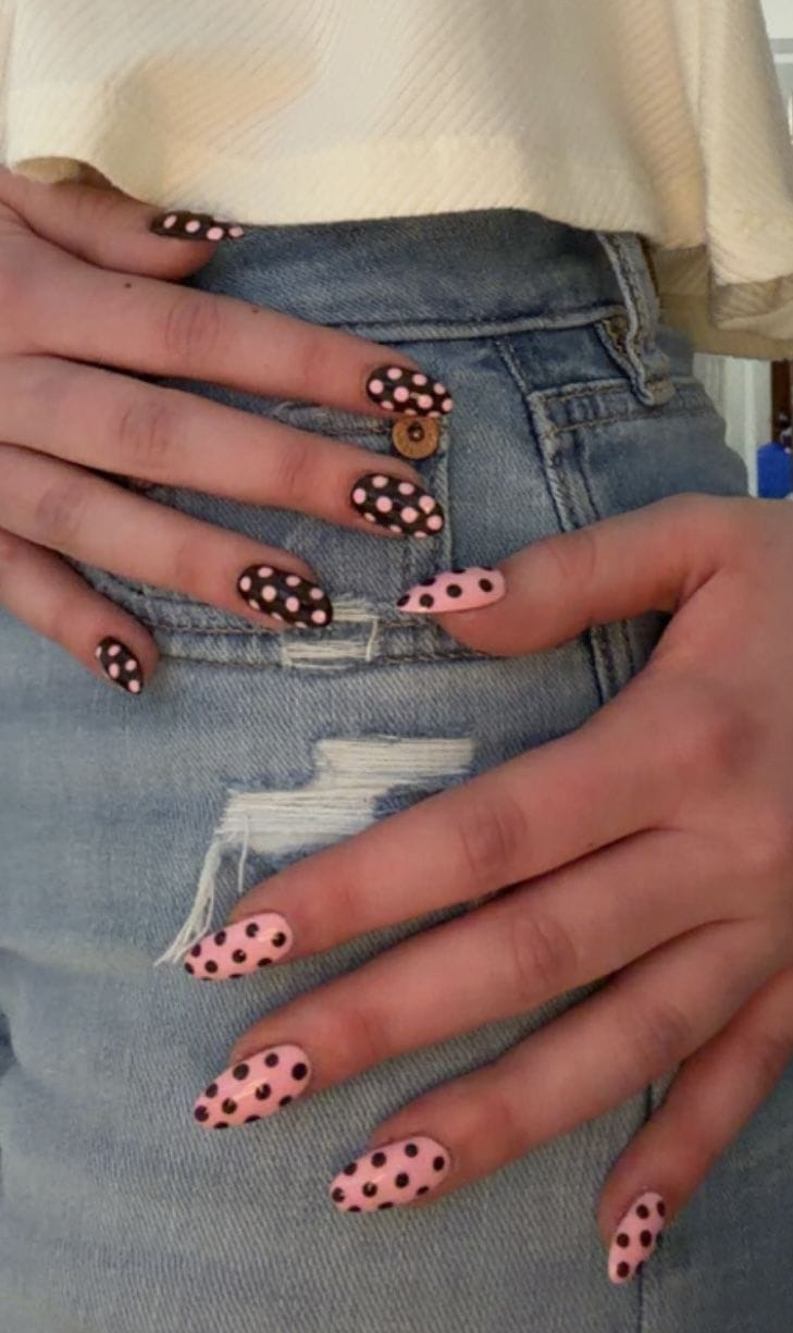Warm pink nails are mixed with deep brown accents, all finished with bold polka dots. The design feels retro-inspired with a cozy yet fun contrast.