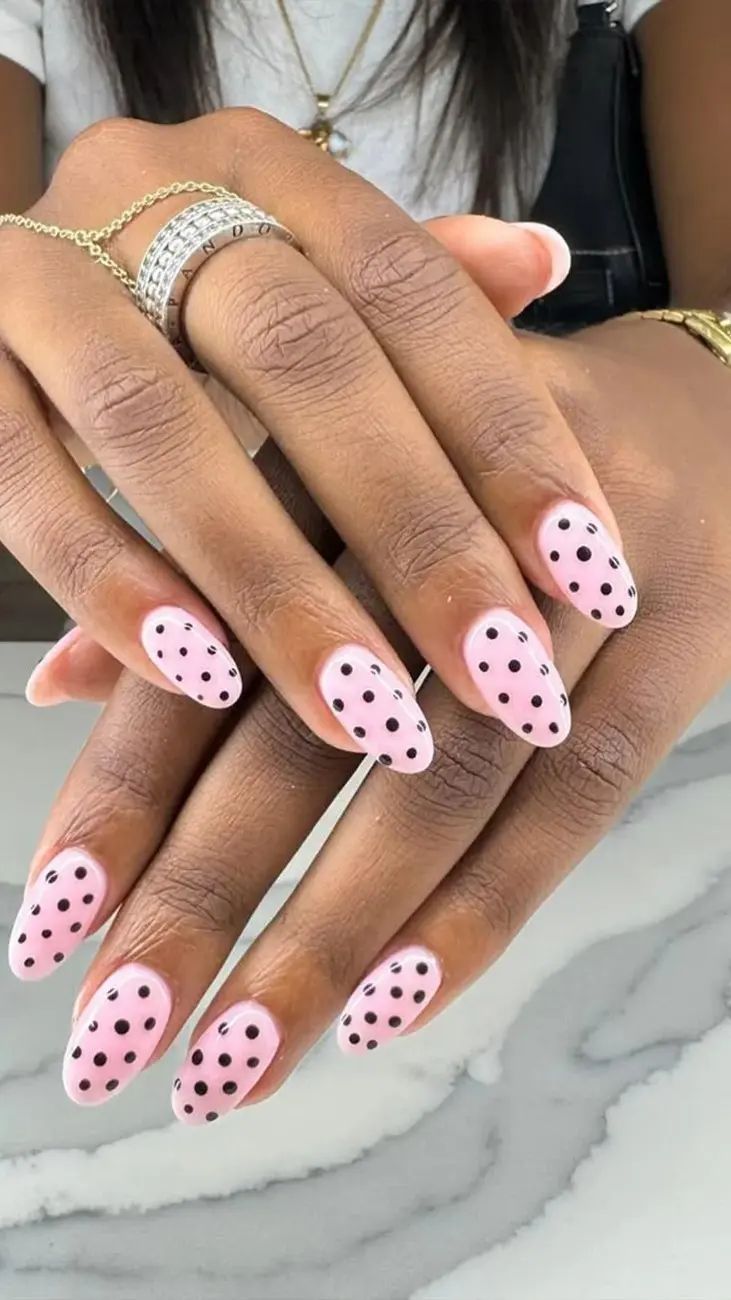 A glossy baby pink base is topped with evenly spaced black polka dots for a timeless look. The style is simple, chic, and slightly vintage.
