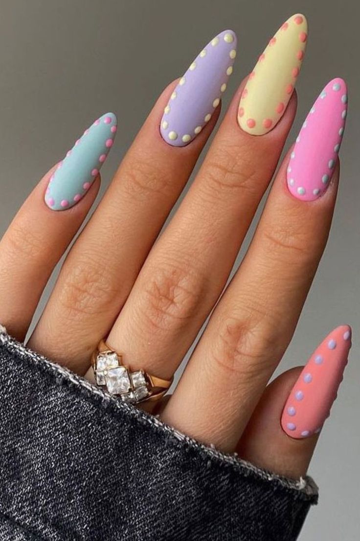 Each nail features a different pastel shade outlined with raised polka dots for a whimsical finish. The overall look is cheerful, colorful, and very spring-forward.