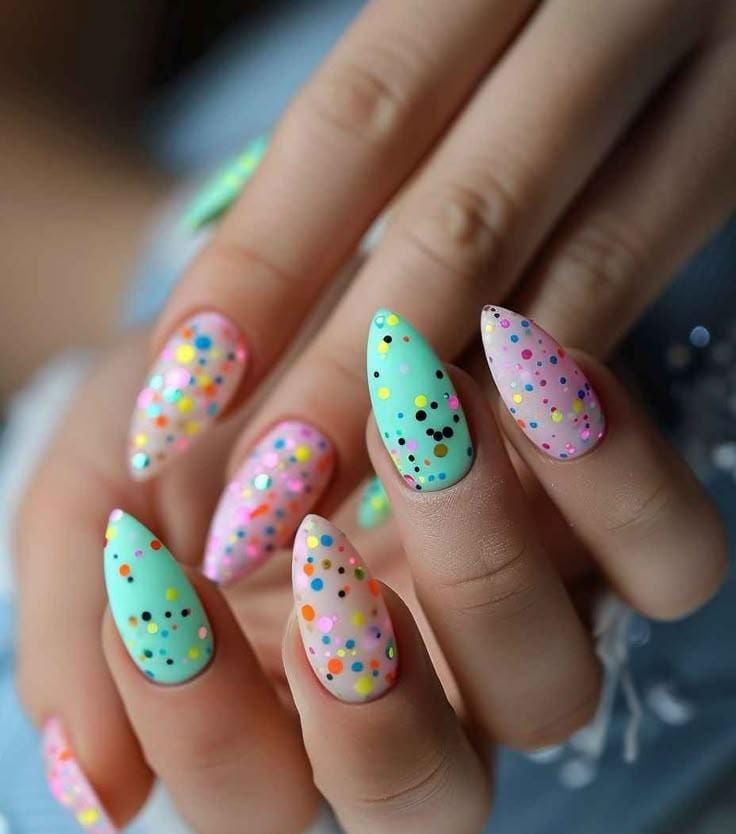 Pastel bases like mint, pink, and lilac are topped with colorful confetti-style dots for a fun, cheerful vibe. This design feels youthful, bright, and perfect for early spring days.