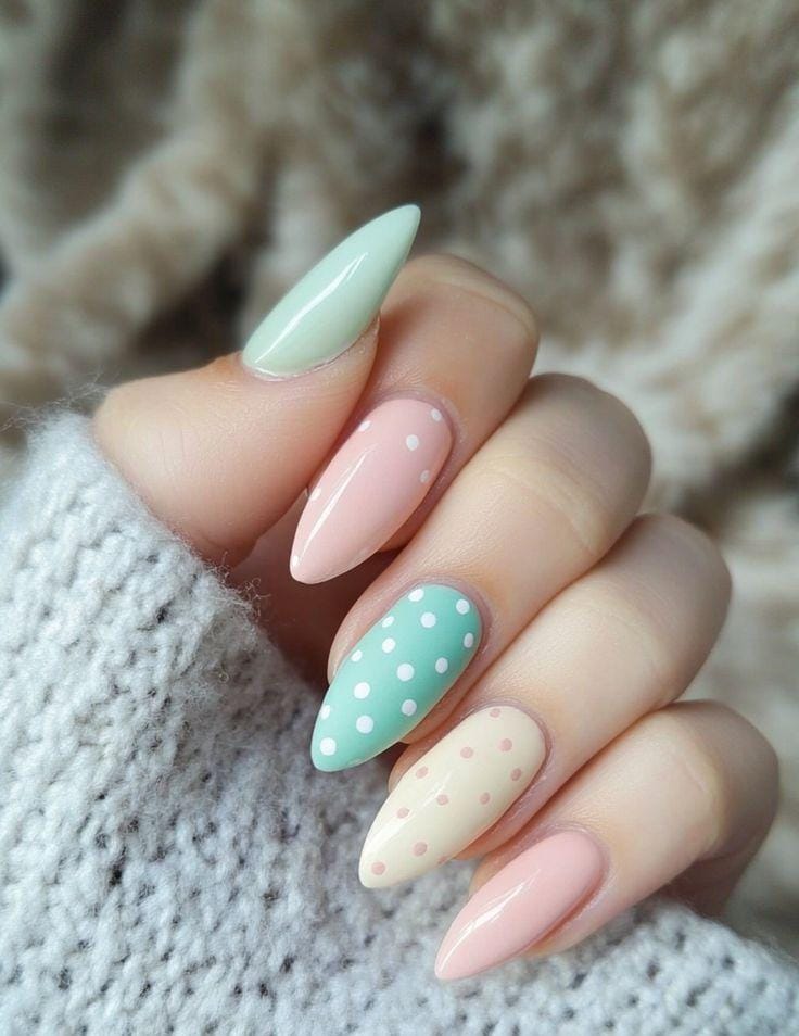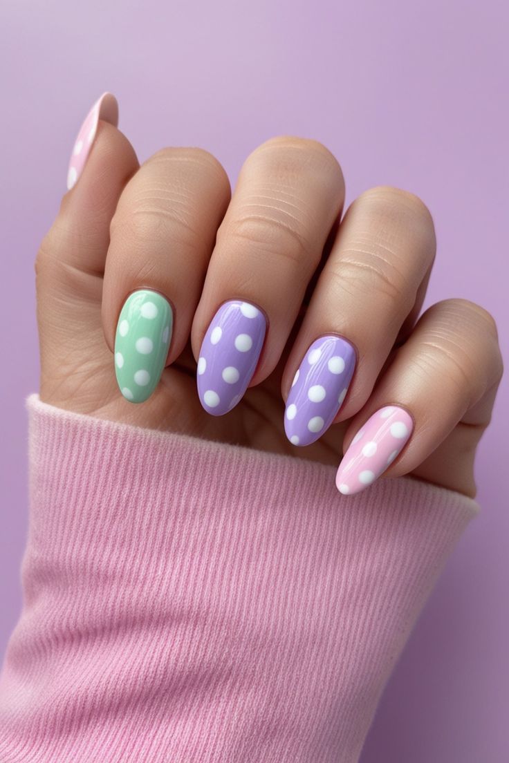 Muted pastel shades like lavender, mint, and pink are paired with clean white polka dots on almond-shaped nails. The overall vibe is sweet, cozy, and softly whimsical.
