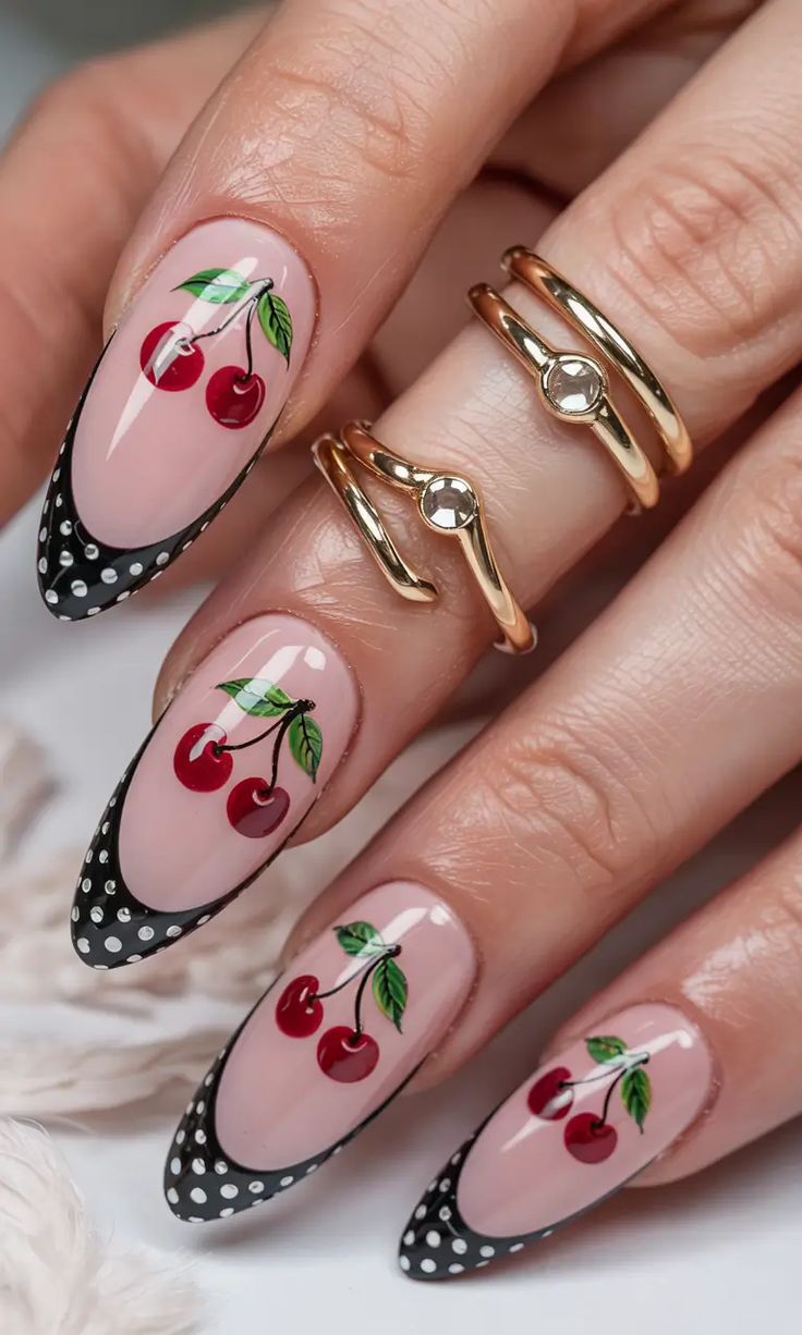 A soft blush base is paired with black polka-dotted French tips and cute cherry art. The design blends retro charm with a fresh, elegant spring vibe.