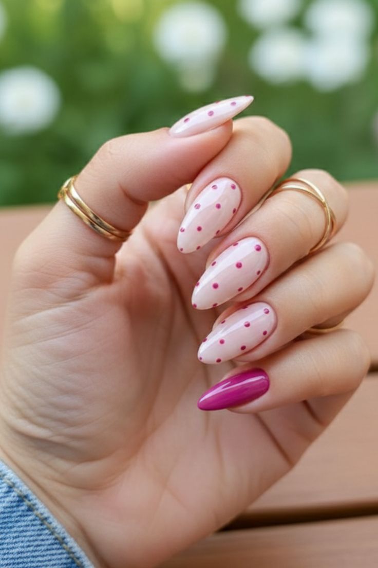 Sheer blush nails with small pink polka dots are paired with a bold berry accent nail. The overall style is soft, romantic, and lightly playful.